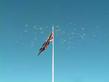 | Ah! This Life is So Everyday after Patrick Caulfield 2002, computer-animated video; unlimited duration A fixed view of a clear sky on a summers day. The sounds of holidaymakers and passing traffic. In the centre of the frame, a Union Jack flutters in a light breeze. Successive waves of seagulls fly high overhead. In each wave, groups of birds fly into letter formations. The choice of letters seems random, and if they spell recognisable words, the birds have dispersed and flown on before a sure reading is possible. |
