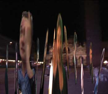 | Good and Bad at Games after Michael Andrews 2002, DVD; 4 minutes A reflection on the fluctuation of social fortune in the self-regarding world of art. In St Marks Square in Venice, as a group of curators engage in a relentless cycle of networking, earnestly circling each other and contributing to a deafening babble of party chat, their images by turn swell with confidence and vanity or diffidently shrink to nearly nothing. |