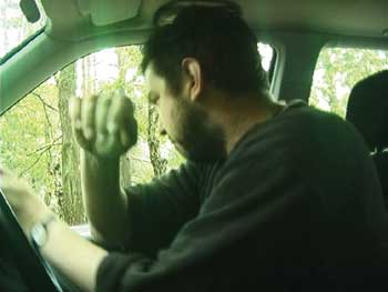 | Girl on a Swing after Fragonard 2002, DVD; 4 minutes Addresses the apparent transferability of the language of the art essay and the universality of drawing. The artist at the wheel of a car: starts the engine; fastens the seatbelt; moves off; manoeuvres the vehicle back and forth around an indeterminate tree-lined area, all the while reciting texts which define or describe the act of drawing. When the recitation ends, he halts the car and switches off the engine. |