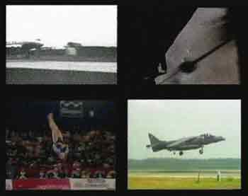 | Land 2002, DVD; 4 minutes A sequence of four, grainy TV clips shown in turn, alternating with split-screen presentation of all four. Each clip shows an object in flight, in the last second before it touches down, but gives way to the next part of the sequence at exactly the moment before the ground is reached. The objects are: a DeHavilland Comet; the foot of Eagle, the Apollo 11 Lunar Excursion Module; a gymnast; a Harrier Jumpjet. |