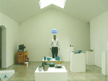 | Thrown Pot after Emmanuel Cooper 2002, DVD; 28 seconds Addresses the role and responsibilities of the curator and the artist. A fixed view of a gallery, where an exhibition of ceramics has been partially laid out on plinths. The artist, his back to the camera and shoes squeaking, walks the length of the gallery, turns, and is seen to be carrying an evidently fragile bowl in his cupped hands. He turns again and pauses, facing back down the gallery, and launches the bowl into the air. The bowl floats gently down and settles on one of the plinths with a slight rattle. The artist walks back down the gallery. |